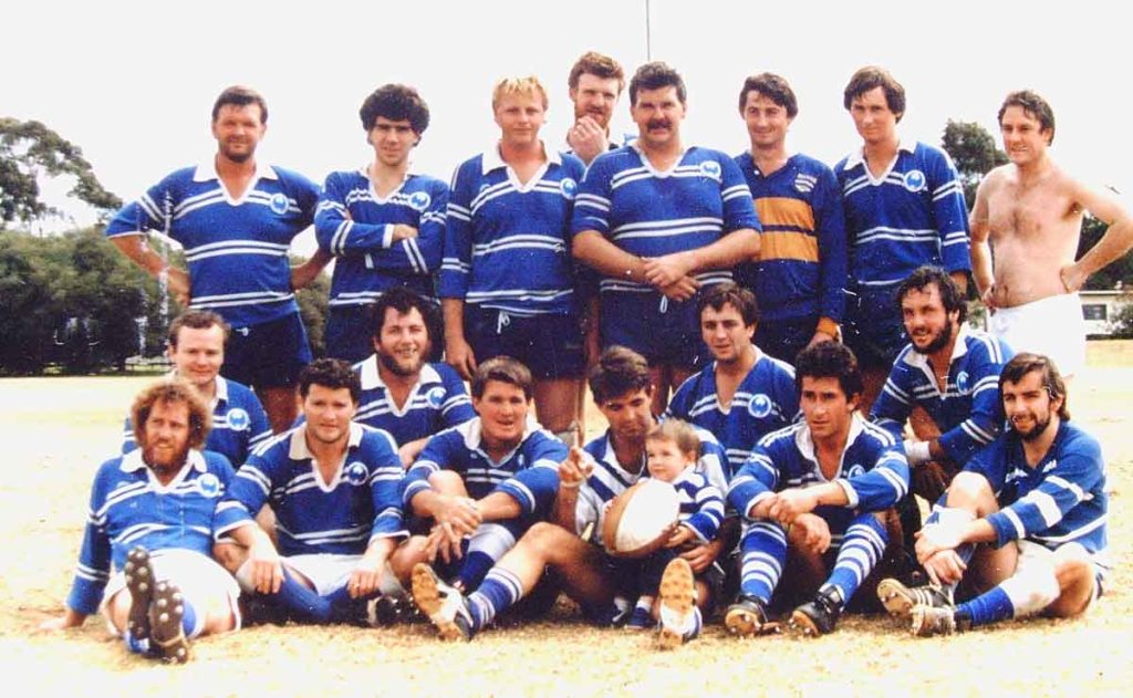 We suspect because of a predomination of Christian Brothers men, “butchers hooks” blue and white bands, won the argument! Our first jerseys were actually the Newtown Rugby League jerseys.